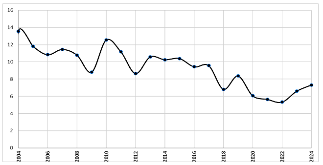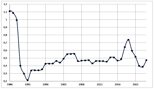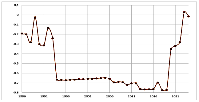 Государство остается важнейшей политико-административной единицей существования и сосуществования обществ даже в условиях заметно продвинувшейся глобализации. Поэтому анализ тенденций (а также процессов и факторов, которые будут рассмотрены в другой статье), влияющих позитивно или негативно на состояние государственной состоятельности (дееспособности) и устойчивости, является исключительно важным как в рамках отдельных го-сударств (особенно для стран Африки и афразийской макрозоны нестабильности, которые имеют короткую историю государственности, – об этом ниже), так и в рамках Мир-Системы. Тенденции, влияющие на состоятельность и устойчивость государств, могут де-литься на внешние и внутренние. При этом корреляция между внешними и внутренними тенденциями может быть как положительная (например, рост международной помощи, участие в международных организациях, позитивное влияние роста рынков и т. д.), так и отрицательная, включая инспирирование и поддержку цветных революций, переворотов, прямых интервенций; экономическое и политическое давление и многое другое (подробнее см.: Гринин 2023а, 2023г). Недавнее падение режима Б. Асада во многом оказалось связанным с внешним давлением и внешней поддержкой антиправительственных сил. Негативные тенденции развития страны, резко усиленные извне, нарастали в течение почти 15 лет, пока не привели к краху режима (Ахмедов 2025).