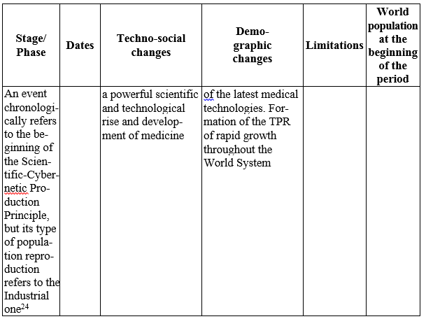 We denote the type of population reproduction associated with the Cybernetic Revolution as the type of qualitative changes, or it may be also called a social-qualitative type. And although over its 70 years' operation, the world population has considerably grown from 2.5 billion people in 1950 to 8 billion in 2022 (UN Population Division 2023), that is, more than a threefold increase, the quantitative growth, in our opinion, will not be the main hallmark of this TPR. And the main characteristics of the new TPR will be associated with the completion of the so-called demographic transition, that is, the low mortality and low birth rates and near-zero or negative natural increase, high life expectancy and a high proportion of the elderly and old population in its general structure.