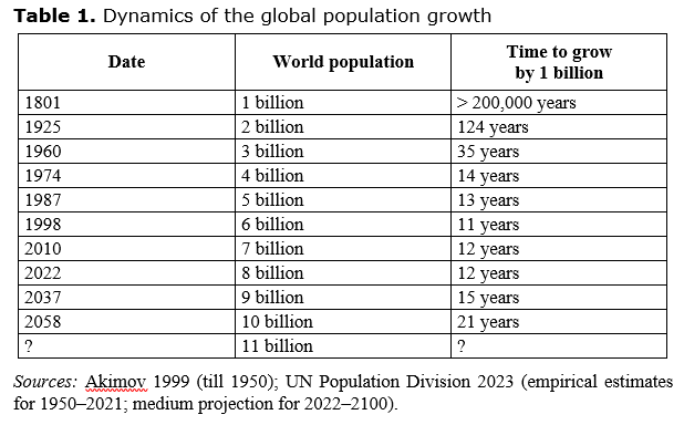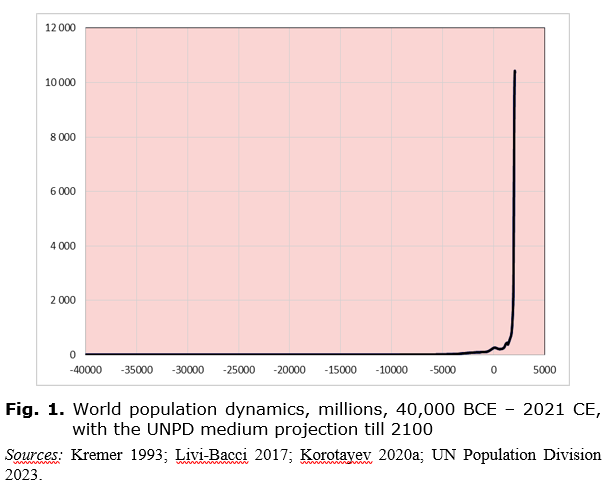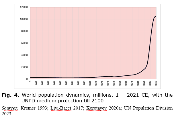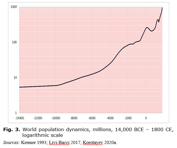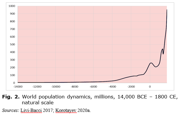 [11] This threshold is dated to 1804, but its estimates vary greatly: from 629 to 961 million people in 1750, and from 813 to 1125 million people in 1800 (see Shcherbakova 2011; e.g., respectively 771 and 954 mln according to Livi-Bacci [2017: 25, Table 1.3]); see also Korotayev 2020a: 590.