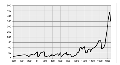 [9] The estimates referring to the beginning of our era range from 170 mln (McEvedy and Jones 1978) to 250/252 (Arab-Ogly 1978: 88; Livi-Bacci 2017: 25, Table 1.3; Korotayev 2020a: 590) and 300–330 million people (Durand 1977; Shcherbakova 2011; Akimov 1999), and sometimes even 400 mln (see Korotayev, Komarova, and Khaltourina 2007: 114; Korotayev, Malkov, and Khalltourina 2006b).