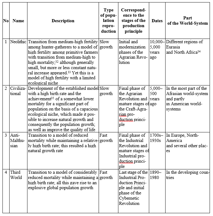Keywords: demographic revolution, demographic transition, production revolution, largest demographic transformations, type of population reproduction, World System, ecological niche, population growth constraints, production principle, productive forces, global aging, Cybernetic Revolution.