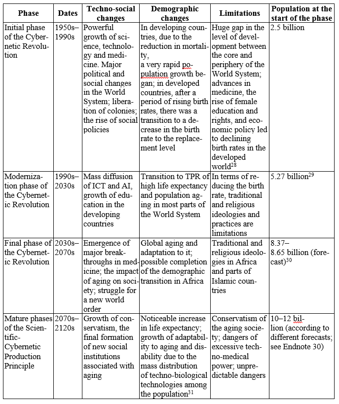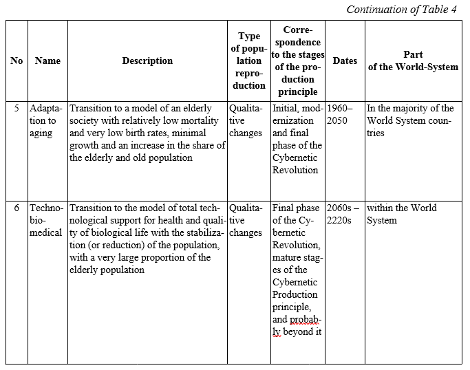 All these ideas about demographic trends from the Upper Paleolithic to the end of the 21st century have also been summarized by us in a convenient tabular form. A particular attention is given to the analysis of the demographic transition in connection with the demographic transformations taking place in the last seven to eight decades; in addition, the connection between the ongoing Cybernetic Revolution and global aging is revealed. Forecasts are made about future demographic transformations associated with the development of the aging process and the formation of a new type of population reproduction. The article was prepared as a part of the research work of the state task of the RANEPA.