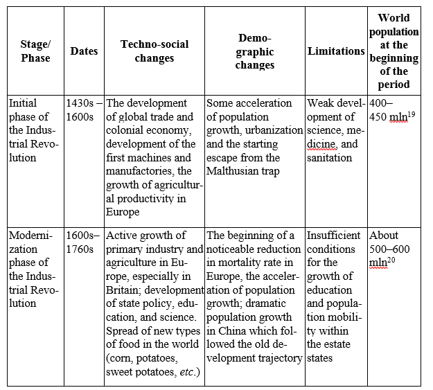 Since the 16th century, one may speak about the beginning of the escape from the limitations of the Malthusian trap (Grinin, Korotayev, and Malkov 2008а, 2008b; Grinin et al. 2009; Grinin and Korotayev 2012b; Korotayev, Zinkina et al. 2011, Korotayev, Malkov, and Grinin 2014). No wonder some growth theorists call the period before 1750 the Malthusian era (Clark 2007; Mokyr and Foth 2010). But this escape was a long and difficult process, ending only in the late 19th century (see above about this in the first article).