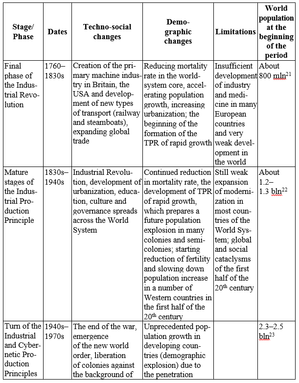 The correlation between industrialization and the largest demographic changes is widely recognized (Armengaud 1976; Minghinton 1976: 85–89; Chesnais 1992; Caldwell et al. 2006; Dyson 2010; Livi-Bacci 2017; Mokyr and Foth 2010). Indeed, while by the beginning of the Industrial Revolution in the second third of the 15th century the World System may have had 400–450 million inhabitants,[10] then at the turn of the 18th – 19th centuries the world population had more than doubled and exceeded 1 billion people.[11] The humanity reached 2 billion in about 1927. And in the early 1950s, the world population exceeded 2.5 billion people (Shcherbakova 2011; UN Population Division 2023).[12] Thus, over the whole period of the Industrial Production Principle (i.e., within 525 years), the population increased by 5.5–6 times. This is noticeably less than the relative growth during the Craft-Agrarian Production principle (see above), but significantly more than the number anticipated for the Scientific-Cybernetic one (with maximum fourfold increase; the world population by the end of the present century will be about 10–12 billion people, or less) [UN Population Division 2023; Vollset et al. 2020]).[13]