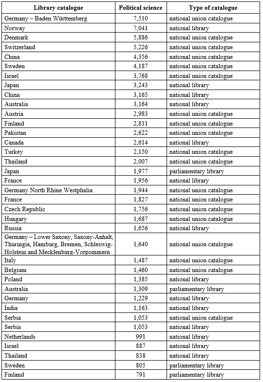 For the purposes of this study we have, among other things, compiled an updated and fairly complete list of the 54 national union catalogues, 76 national libraries, 15 parliamentary libraries and nine international organization libraries that offer online catalogues of their data, and analysed how many items with the English title word ‘political science’ are present in these libraries. The devastating result of our research is that only 30 of the 54 national union catalogues, 18 of the 76 national libraries, 4 of the 15 parliamentary libraries and 7 of the 9 international organizations surveyed had library holdings of more than 1,000 items with the explicit title word ‘political science’. And yet, the global interest in political science is huge and beyond our expectations. To measure this global interest, our article looked at the download statistics of the main Wikipedia articles on ‘political science’ in their respective languages. Our analysis shows that there is a huge global interest in our subject, which is not being met by current publications.