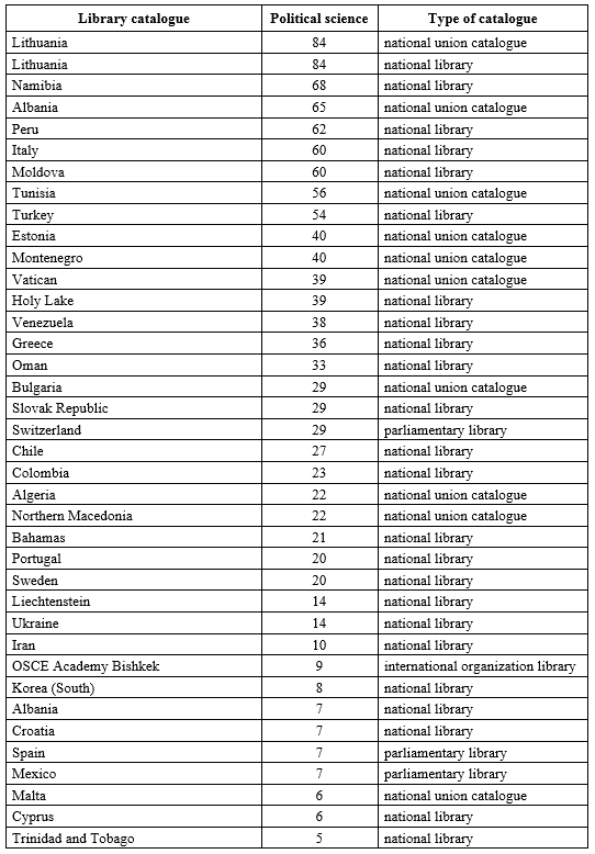 The Western leaders in the number of political science documents, as it already emerged from Table 8, are the United States, the United Kingdom, Germany, Australia, Canada, France, Netherlands, Italy, Spain, Switzerland, and Japan. Table 9 shows how these countries play a dominant, not to say overwhelming, role in the international library union catalogue OCLC WorldCat, despite improvements in recent years.